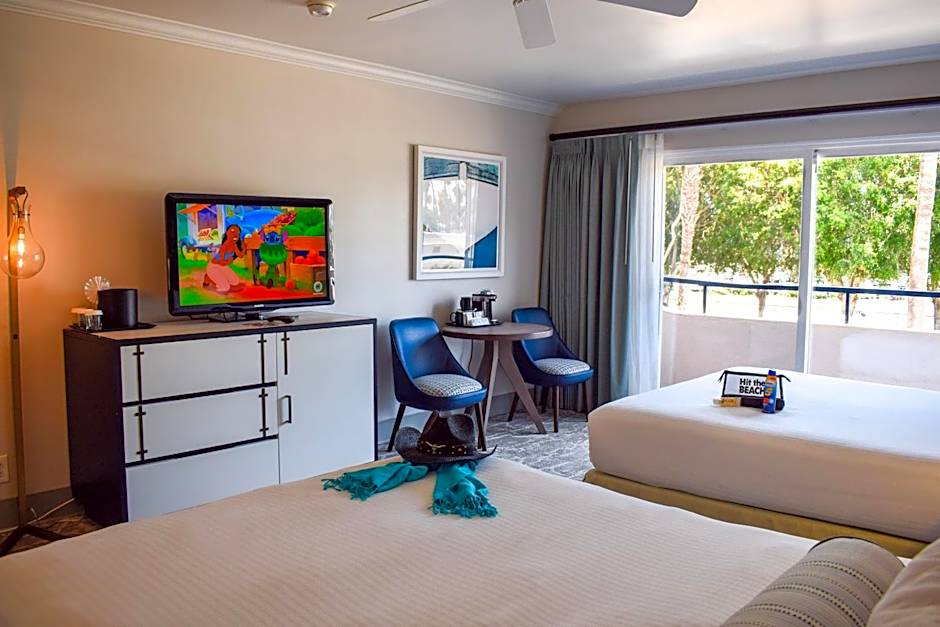 This spacious double room faces the Santa Barbara Harbor and features a seating area . Amenities include a refrigerator, cable TV with premium channels and air conditioning. High - speed WiFi, a coffee/tea maker, and other amenities are provided.